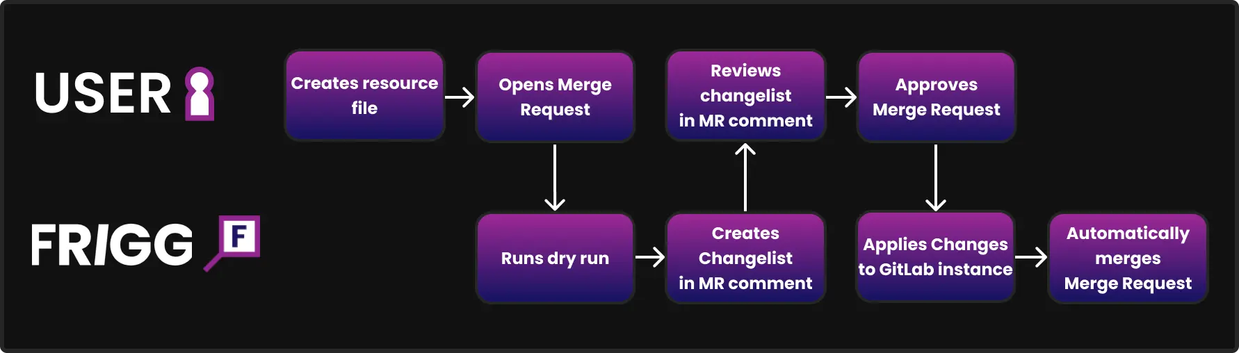 Frigg itself is a GitLab repository, just like any other repository. Changes to resources are applied by creating a merge request to the default branch of Frigg’s repository after editing the corresponding resource file.